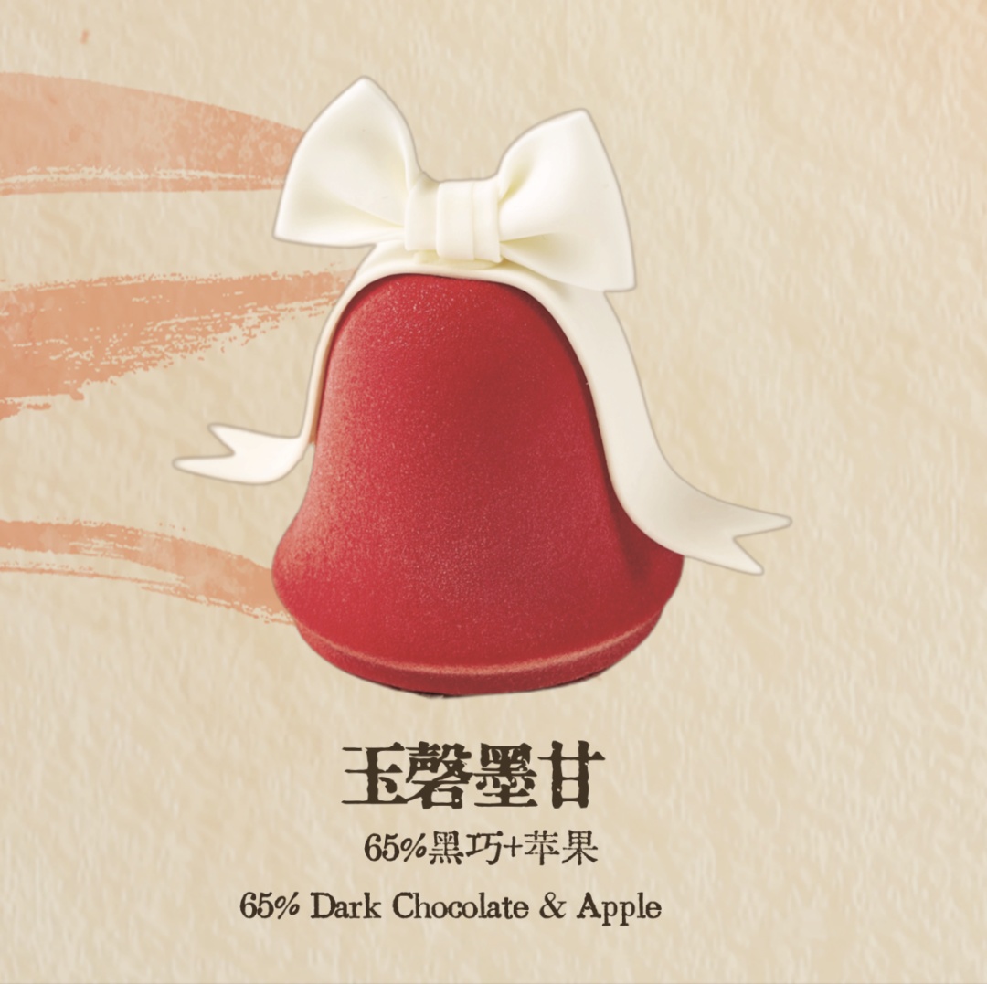 这款铃铛蛋糕灵感源于陈湘波《鹏城杜鹃红》。朱砂红的糖霜像画里漫山杜鹃的明艳,黑巧的焦墨感搭配苹果流心的清甜,一口下去像敲开了古画里的玉磬,开启新年甜蜜模式!