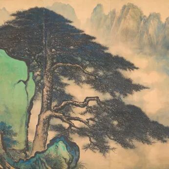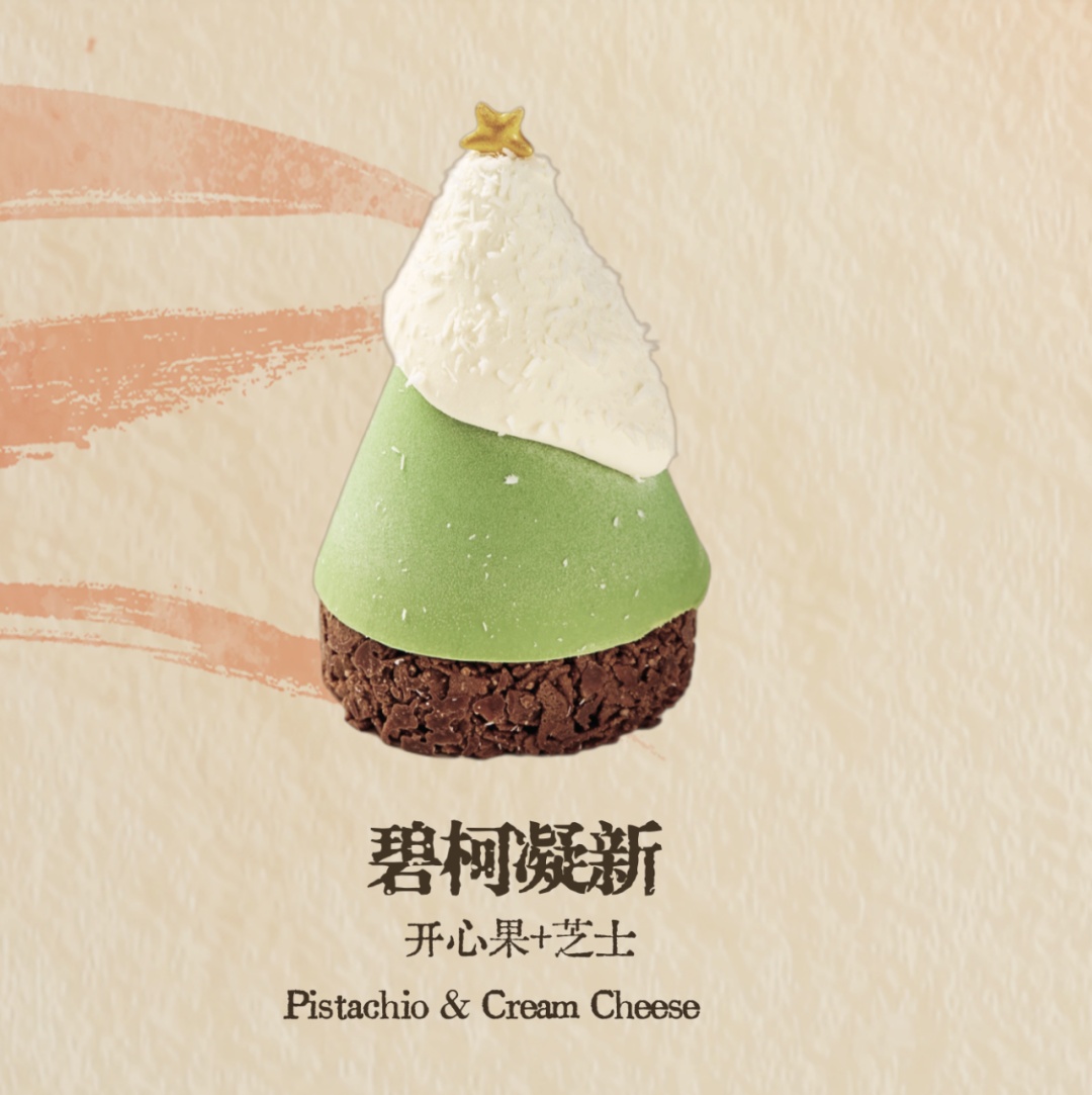 树形蛋糕的灵感源自在展岭南艺术大师黎雄才《迎客松》。开心果霜像松针一样翠绿,脆片做的枝干超有质感,芝士雪顶就像晨雾笼罩~吃一口,祝新的一年像松树一样长青!