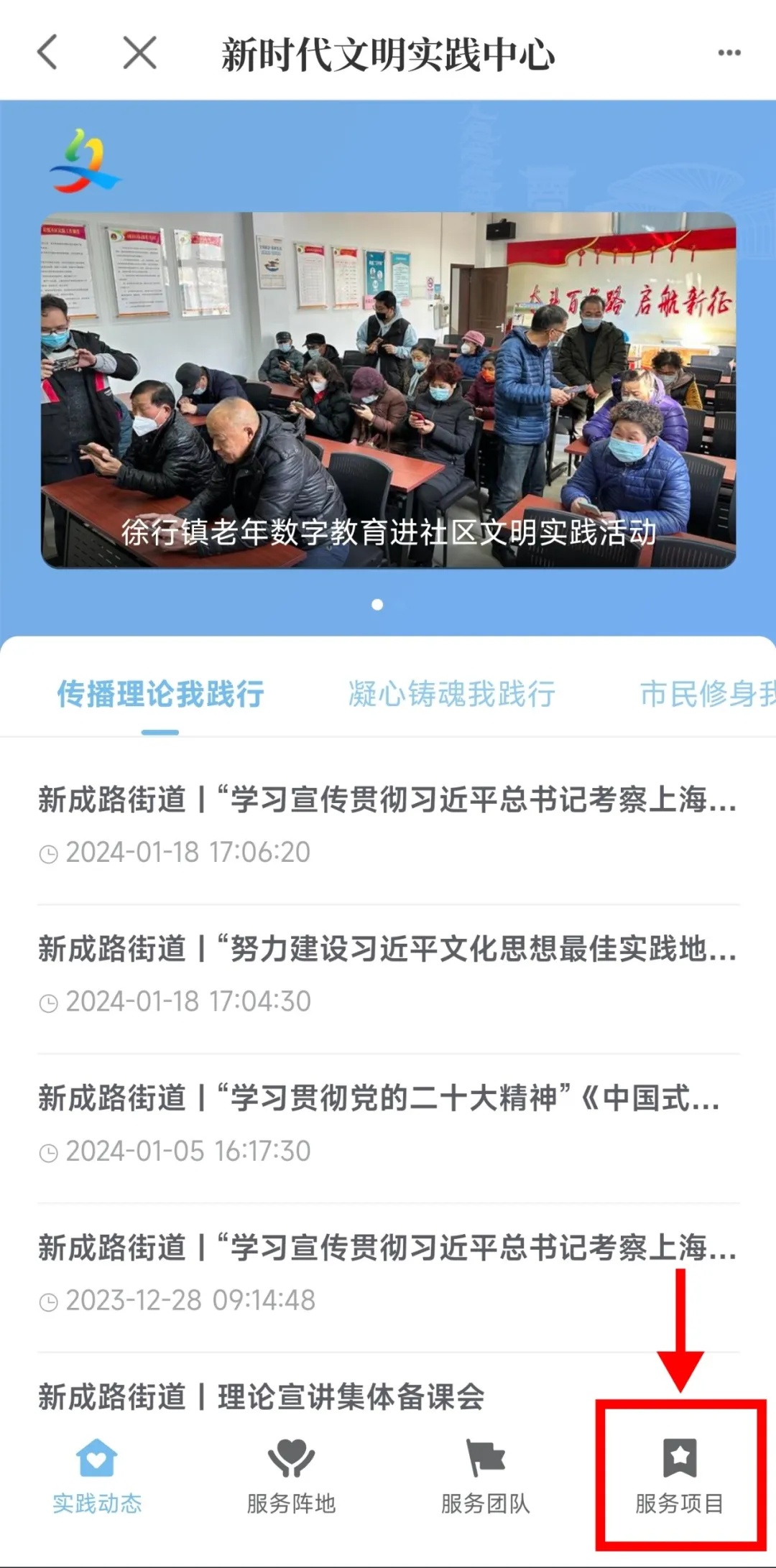 2. 点击首页“嘉定区新时代文明实践中心”。