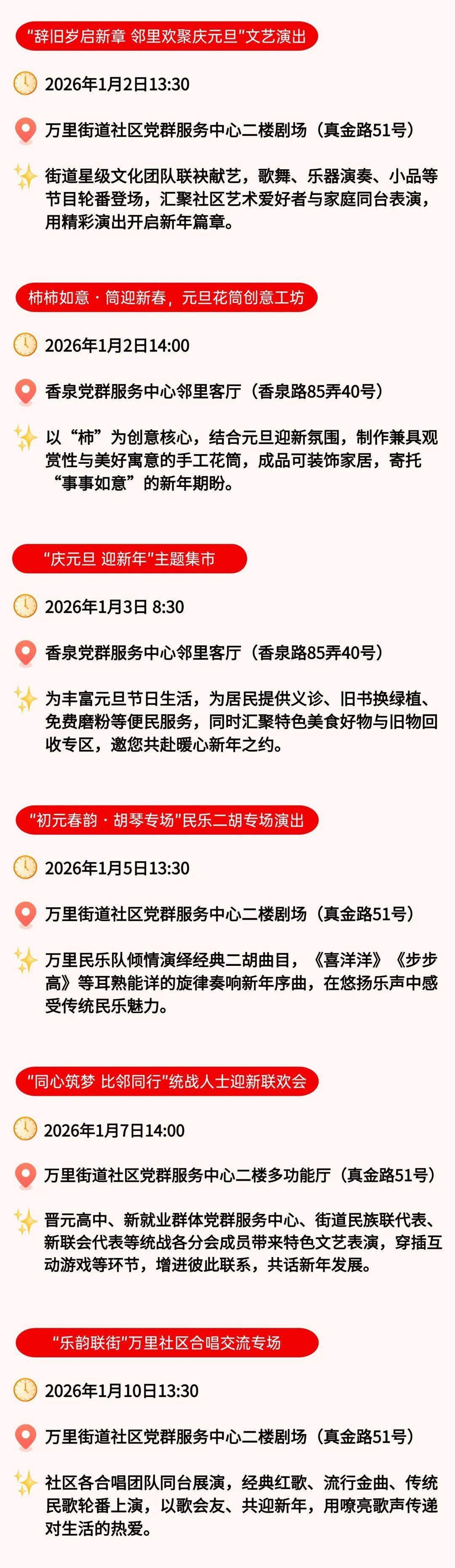 元旦的精彩才刚刚拉开序幕,春节期间万里街道还将推出新春文艺汇演、围棋AI对弈体验、元宵花灯制作、猜灯谜等更多丰富多彩的活动,涵盖集市购物、文体互动、暖心服务等多元场景,让大家在整个节日期间都能收获满满欢乐与温暖。