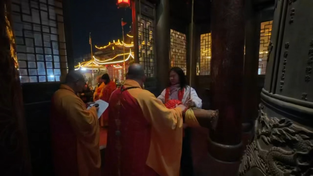 临近零点,钟楼之下的人群逐渐安静下来,所有目光不约而同地聚焦于那座承载着期盼的钟楼。“当——”第一声浑厚悠远的钟声穿透夜色,涤荡人心。随后,钟声次第响起,共计108次,声声沉稳庄重,在古寺的庭院间久久回荡。