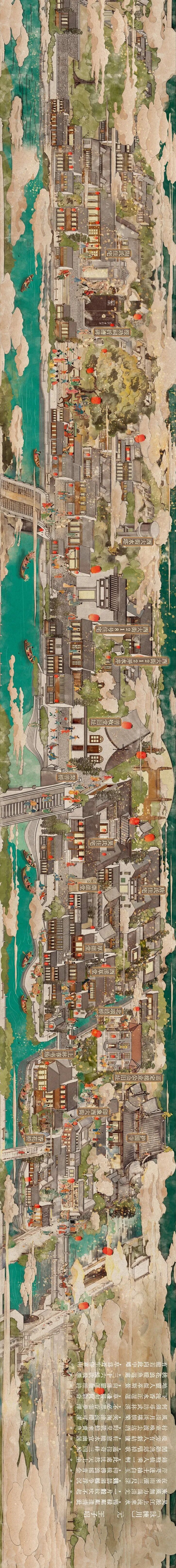 画卷里,既有对过往的深情回溯,也有对未来的美好期许。护国寺香花桥在画中得以复原,香客往来、虔诚祭拜的场景也随之重现;而上林春书场内外,听书人饮茶闲聊、乘船而来的热闹,也跃然纸上。此外,李丹和团队成员还与运营方深入沟通,将未来可能呈现的新业态、新空间融入画中,勾勒出一幅既延续历史文脉、又充满当代活力的生活图景。
