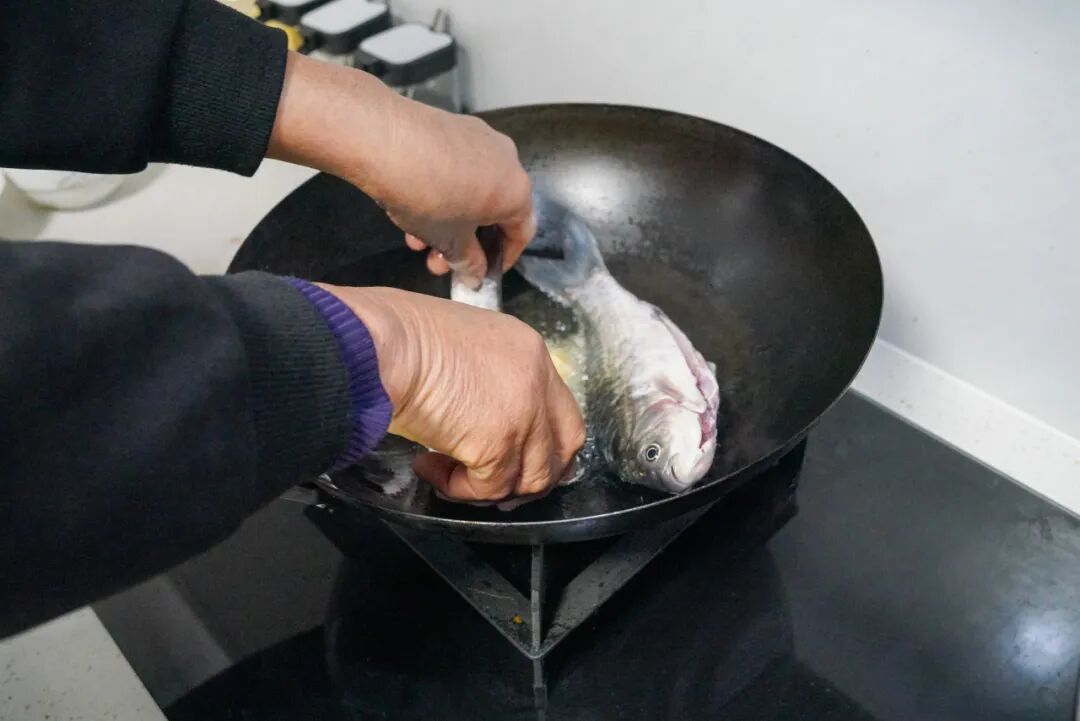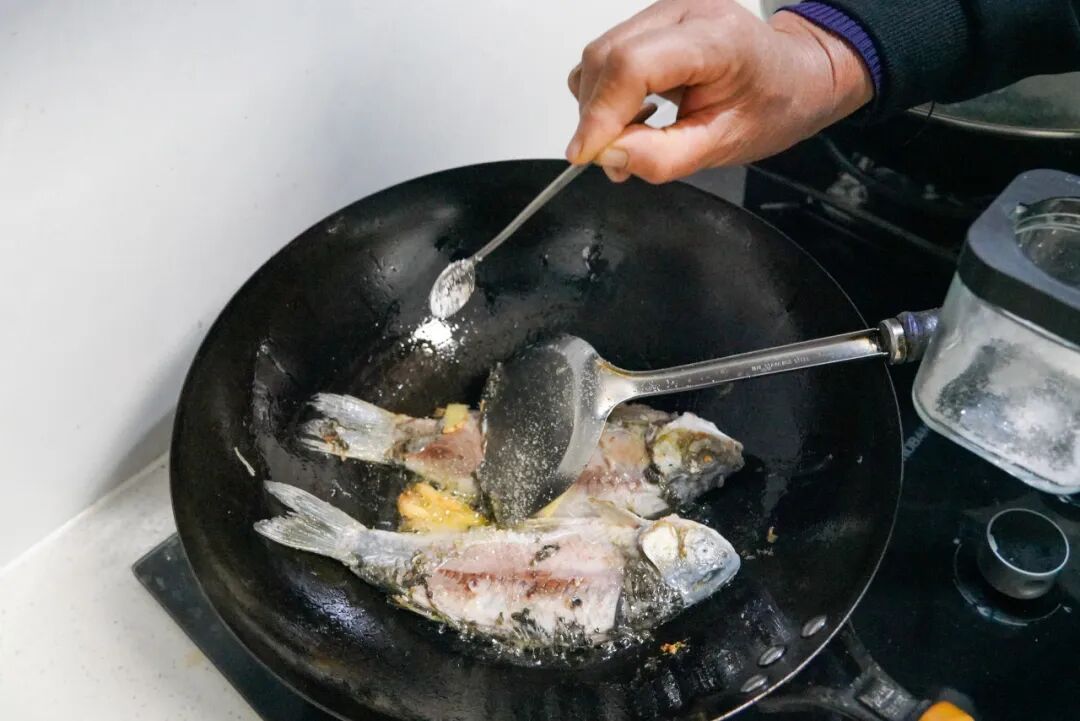 热锅下油,鲫鱼入锅的瞬间,滋啦作响,香气四溢。洪阿嬢说:“煎鱼最忌心急,得等一面定型再轻轻翻动,两面都煎到金黄焦香,才算合格。”她握着锅铲的手稳当得很,多年的经验让每一步都恰到好处。