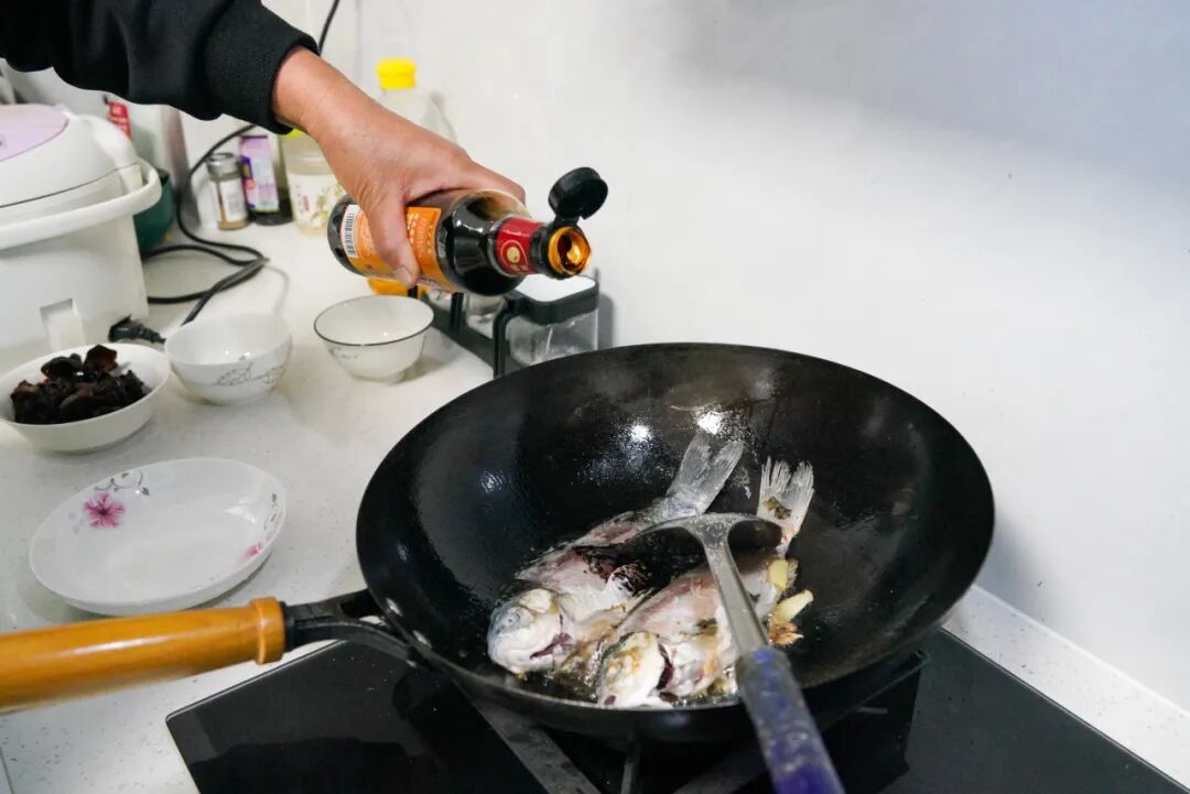 两面煎得金黄的鲫鱼,在锅里滋滋冒着油。这时候,生抽提鲜、老抽上色,再撒上一勺盐,洪阿嬢的“灵魂秘诀”这才登场——几粒亮晶晶的冰糖。“可别小看这几块冰糖,它是红烧鱼的魂!少了它,鱼肉的鲜味就少了一层,吃起来总觉得差点意思!”洪阿嬢分享道。