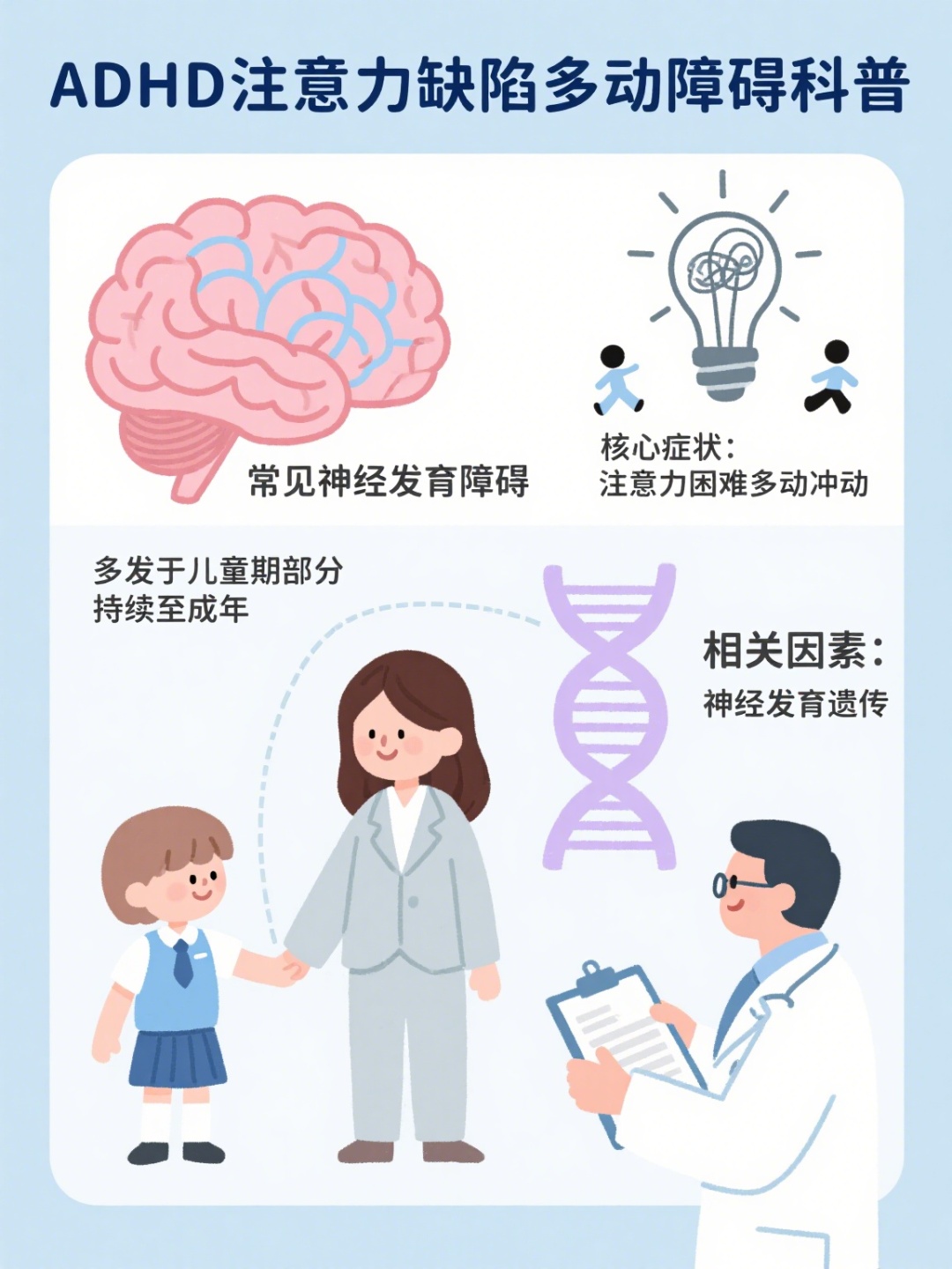 根据《中华儿科杂志》刊载的《注意缺陷多动障碍早期识别、规范诊断和治疗的儿科专家共识》,ADHD是注意缺陷多动障碍(Attention Deficit Hyperactivity Disorder)的缩写,是一种常见的慢性神经发育障碍,起病于童年期,影响可延续至成年。
