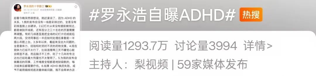 公开资料显示,罗永浩是较早进入中国公众视野的成人ADHD人士之一。早在2016年,他就曾公开讲述自己的确诊经历。