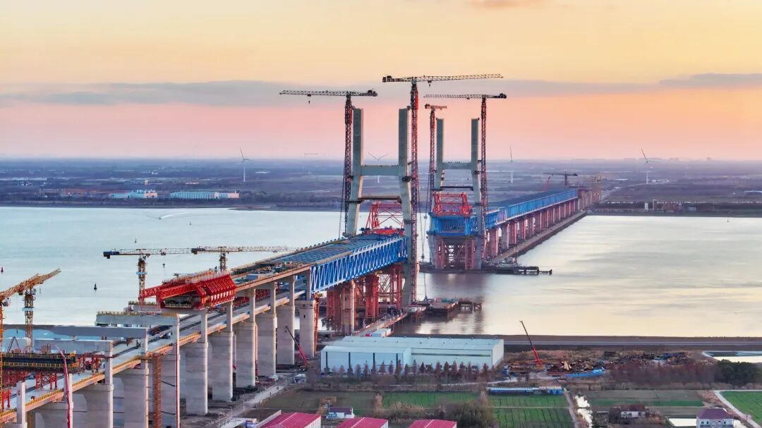 日前,中铁大桥局新建上海至南京至合肥高铁沪宁段站前Ⅴ标项目部传来消息,世界最大跨度公铁两用无砟轨道斜拉桥——崇启公铁长江大桥已完成总工程量的85%,主塔封顶、非通航孔钢梁顶推等关键节点均顺利实现,全面进入斜拉索挂索阶段。根据施工安排,预计2026年5月实现主桥合龙。