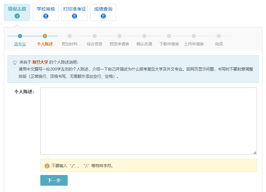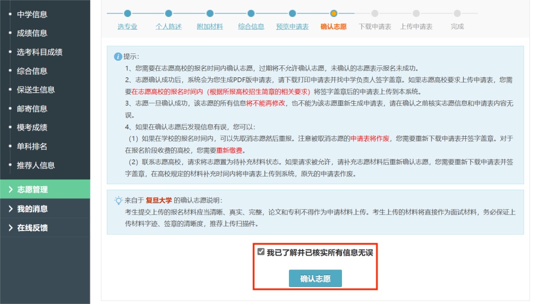 请认真核对申请表中的各项信息,确保所有信息按志愿高校要求填写并且准确无误,信息错误会导致报名无效。申请表里只显示学校要求的模考成绩和单科排名,提示信息(以红色文字显示)不会出现在下载版申请表中。确认之后请点击“下一步”。