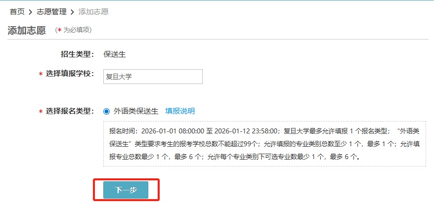 2. 选择填报学校:复旦大学;选择报名类型:外语类保送生。