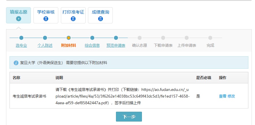 通过下载链接下载《诚信考试承诺书》并打印,签字扫描后上传。完成后请点击“下一步”。