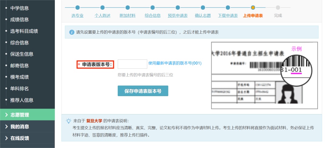 考生提交上传的报名申请材料应当清晰、真实、完整,该材料将直接作为面试材料。材料中若存在虚假内容或者隐匿可能影响全面评判考生的重大事实,一经发现,取消继续参与后续选拔认定程序的资格;已经获得保送生入选资格的,取消相应资格;已经入学的,按教育部和我校相关规定处理。