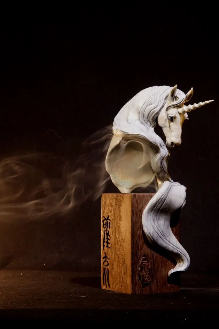 展览中,《神骏·赤兔》以北齐陶马为规制,香随鞍起,寓意驰骋志远;《神骏·白龙》通体皓洁,烟络萦绕,象征心境清宁;《逸马澜氤》则以《山海经》独角灵兽“䑏疏”为蓝本,低首饮烟,静中寓动,传递闲逸安然之韵。