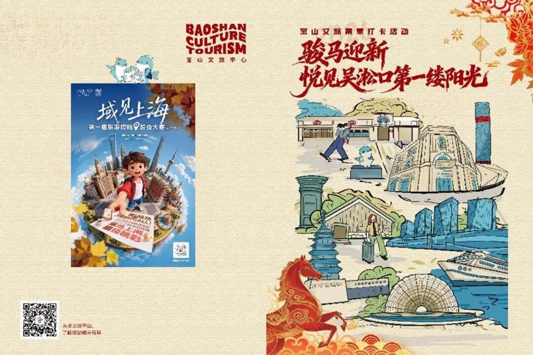 “旅选上海 超级元旦”打卡活动 宝山专属集章活动 2026“骏马迎新 悦见吴淞口第一缕阳光” 诚邀您以集章为引 开启一场与吴淞口的深度对话 一起来看看活动详情吧! 2026年1月1日—2月23日,参与“骏马迎新 悦见吴淞口第一缕阳光”宝山文旅集章打卡活动,集齐7个不同的印章,即可兑换一份新年好礼。数量有限,兑完为止。 吴淞口国际邮轮港旅游综合服务中心 地址:宝杨路1弄3号B座 联系电话:021-36516999 时间:1月1日—2月23日8:30-17:00 兑换以下随机任一福利:旅行手账笔记本/镭射包/行李牌/宝山景点主题桌垫/旅行随行杯/旅行收纳包等。礼品数量有限,兑完为止。 1.吴淞口国际邮轮港旅游综合服务中心 2.上海吴淞炮台湾公园 3.“长江11号”主题邮局 4.上海·海上世界 5.上海淞沪抗战纪念馆 6.长滩观光塔 7.合兴馆 盖章点:服务台(宝杨路1弄3号C座) 时间:8:30-17:00 领取集章打卡手册,骏马迎新,悦见吴淞口第一缕阳光。朱自清先生24岁时在宝山向友人发出的“你若能来,皆大欢喜”盛情邀约,跨越百年,与你相约上海国际邮轮旅游度假区。 上海伊敦康得思酒店 地址:吴淞口路166号 坐拥三江交汇与邮轮母港的壮阔景致,海派风情客房将滨江美景尽收眼底,开启美好新年。 上海国际邮轮港壹棠服务公寓 地址:吴淞口路108号 以森屿海洋为主题,助力宾客于优雅客房与温暖氛围中开启新年童话之旅,沉浸梦幻海洋世界,共度美妙亲子时光。 途易蓝吴淞口邮轮港酒店 地址:吴淞口路517号 以高端餐饮、高品质服务与新中式雅致客房迎接四方宾朋,让美食与雅居共奏温馨惬意的迎新年乐章。 盖章点:入口处(宝杨路1号,公园北门) 时间:6:00-18:00 公园位于长江与黄浦江交汇处,因清顺治年间修筑炮台而得名“炮台湾”,总面积106.6公顷,其中湿地率达60%。新春之际,漫步湿地江畔,愿您马年奔腾、步步高升。 邻江壹号国际邮轮酒店 地址:宝杨路1弄3号1幢 坐拥开阔江景,以现代舒适的客房与温馨服务,诚邀宾客倚窗静赏水岸流光,共迎新岁静好时光。 一尺花园(矿坑花园店) 地址:宝杨路1号(上海吴淞炮台湾公园) 坐拥蓝绿色的矿湖,在氤氲的咖啡香中,再读矿坑的故事。 盖章点:服务台(宝杨路1号,近上海吴淞炮台湾公园) 时间:9:00-16:00(周一馆休,春节开放时间以官方公布为准) 世界首个以河流流序命名的邮局,新春旅“邮”,马到成功! 吴淞口国际邮轮港 地址:宝杨路1号 亚洲第一、全球第四大邮轮母港,银色的建筑立面,就像明亮的眼睛注视远方,被誉为“东方之睛,海上画卷”。 盖章点:客服台(吴淞口路60号L1,近追风冰雪世界) 时间:10:00—22:00(春节营业时间以官方公布为准) 上海首座邮轮主题滨水文旅综合体,新春打卡,马上有福! 吴淞口灯塔 地址:黄浦江与长江汇流处(远眺) 吴淞口灯塔是重要的助航标志,也是上海国际航运中心和上海港的标志性建筑及观景点之一。 盖章点:二期服务台(吴淞口路813号) 时间:9:00—16:00(周一馆休,春节开放时间以官方公布为准)全国唯一反映两次淞沪抗战的专题纪念馆,激励华夏子孙“铭记历史、缅怀先烈、珍视和平、警示未来”。 观海驿站 地址:吴淞口路508号(宝山滨江公园内) 在蓝色的梦幻滨水驿站,和萌物阿宝一起度过惬意的休闲时光。 宝山德尔塔酒店 地址:双庆路220号 泡温泉、赏江景,一站式体验新年欢乐,尽享奢华度假时光。 盖章点:乐营探索乐园服务台(云海路59号B1楼) 时间:10:00-18:00(春节营业时间以官方公布为准) 长滩观光塔如同“定海神针”,是上海国际邮轮旅游度假区的标志性建筑。国内首家垂直探索乐园“乐营探索乐园”云端瞰三江、“上海港掠影”展藏着千年港史,15-18层“一尺花园”江景咖啡香飘云端……新春登高望远,马年更上一层楼! 一尺花园(定海神针店) 地址:云海路59号15-18层 在半城山海的诗意留白中品味城市与江河共生的独特魅力。 长滩音乐厅 地址:富锦东路68号 建筑设计灵感源自《西游记》中的“东海龙宫”,外形如同一颗精雕细琢的水晶,寓意吉祥。 灯塔营地 地址:吴淞口路318号南侧地块 在开阔的江畔草坪上体验从日出观景到星空露营的多样乐趣,感受城市与自然交融的独特魅力。 盖章点:收银台(友谊路40号) 时间:6:30-14:00,16:30-21:00(春节开放时间以店方公布为准) 重拾宝山百年风味,传承非遗美食技艺。宝山红烧鮰鱼与金鼎奖小笼包,邀您共赴新年舌尖之旅。 福楽Bistro·玫瑰花园餐厅(滨江公园店) 地址:吴淞口路577号 相约福楽,把浪漫融进食物,把餐厅变成秘密花园。 宝山滨江公园 地址:吴淞口路508号 在宝山滨江公园,与海风与大树为伴,让壮丽的江景和清爽的江风,助你开启充满希望与活力的新年! MANNER咖啡 地址:吴淞口路508号1层(宝山滨江公园内) 坐拥壮阔江景与自然生态,滨江的清风、涛声与咖啡香交织。 从滨江公园的明媚,到邮轮母港的壮阔 从音乐厅的灵动,到海上世界的活力 印章串联起的 是吴淞口百变的魅力侧影 “骏马迎新”集章之旅 邀您悦见风景、悦见生活 打卡收藏上海新年的第一缕晨光,吴淞口日出摄影展开启新年特展→ 买菜专线”来了!定制公交DZ577正式开通 吴淞口国际邮轮港丝滑进港登船攻略在此→