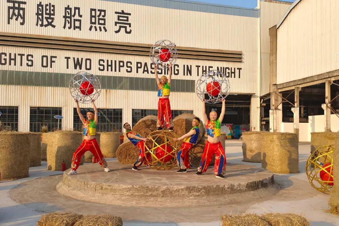 中华船厂空场地前,“被夜晚相遇的两艘船照亮”的是从乡村搬运来的“瑞士卷”。这些草垛搭建而成的戏台和迷宫,成为孩子们嬉戏的场所。当非遗艺术表演时,总会被市民团团围住,仿佛真的回到“乡村大集”;技艺所承载的活态文化与西方雕塑、西洋乐和科技感碰撞,构成了复兴岛多元文明的艺术表达。