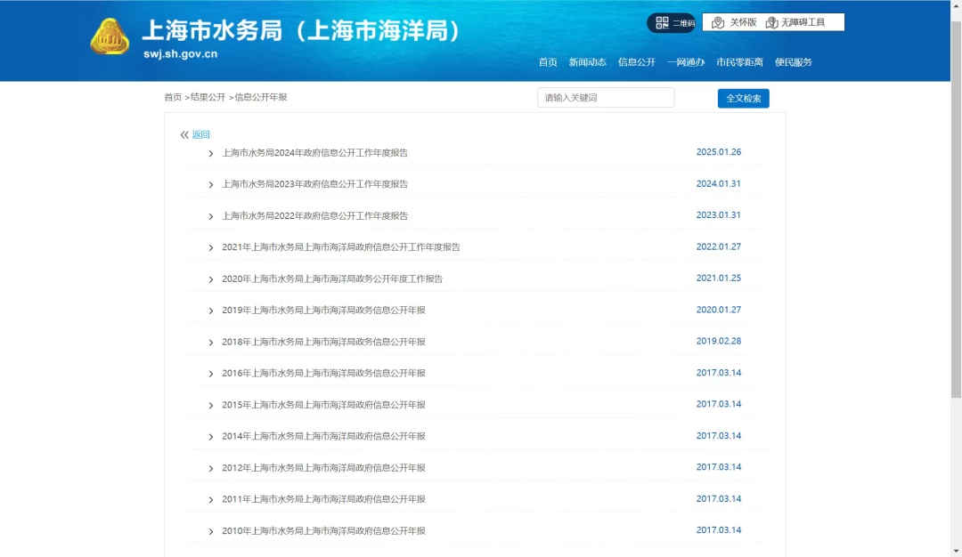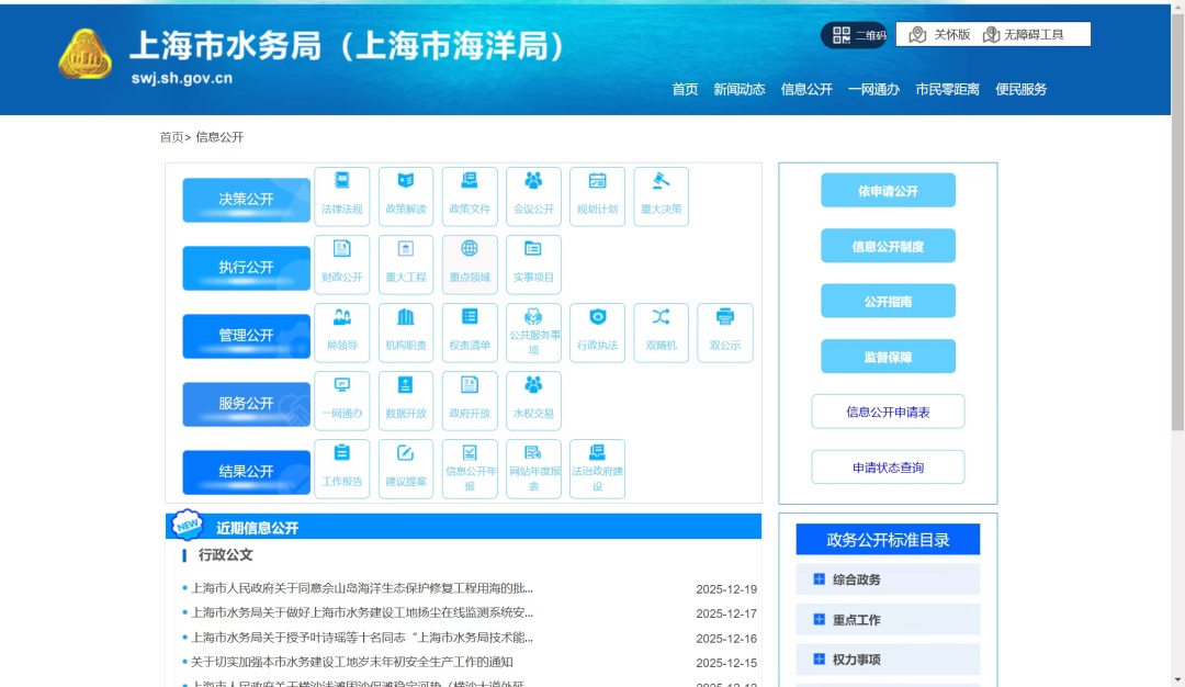 二十年来,上海市水务局逐步深化政务公开体系建设,形成了系统化、规范化、专业化的政务公开体系。公开内容逐步扩展到“规划计划”“业务动态”“财政信息”“人事任免”等领域,如今,已覆盖“水务基础设施建设”“河湖水环境治理”“水资源节约集约利用”“水旱灾害防御”“现代海洋城市建设”等多个重点领域。建立了一套规范完善的依申请公开机制,无论是窗口咨询、线上申请,还是结果反馈,都形成了闭环流程,让市民和企业能精准获取所需信息。体制机制的构建与完善,不仅使政府信息公开工作迈入正轨,更在市水务局与企业群众之间架起了一座坚实的信息桥梁。