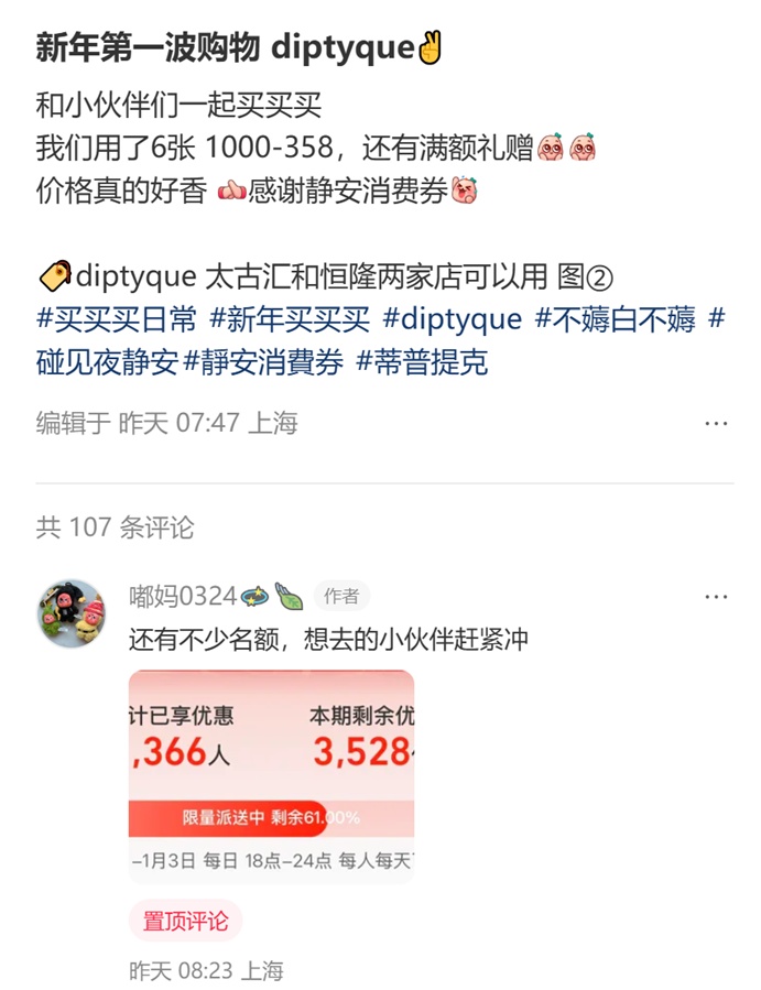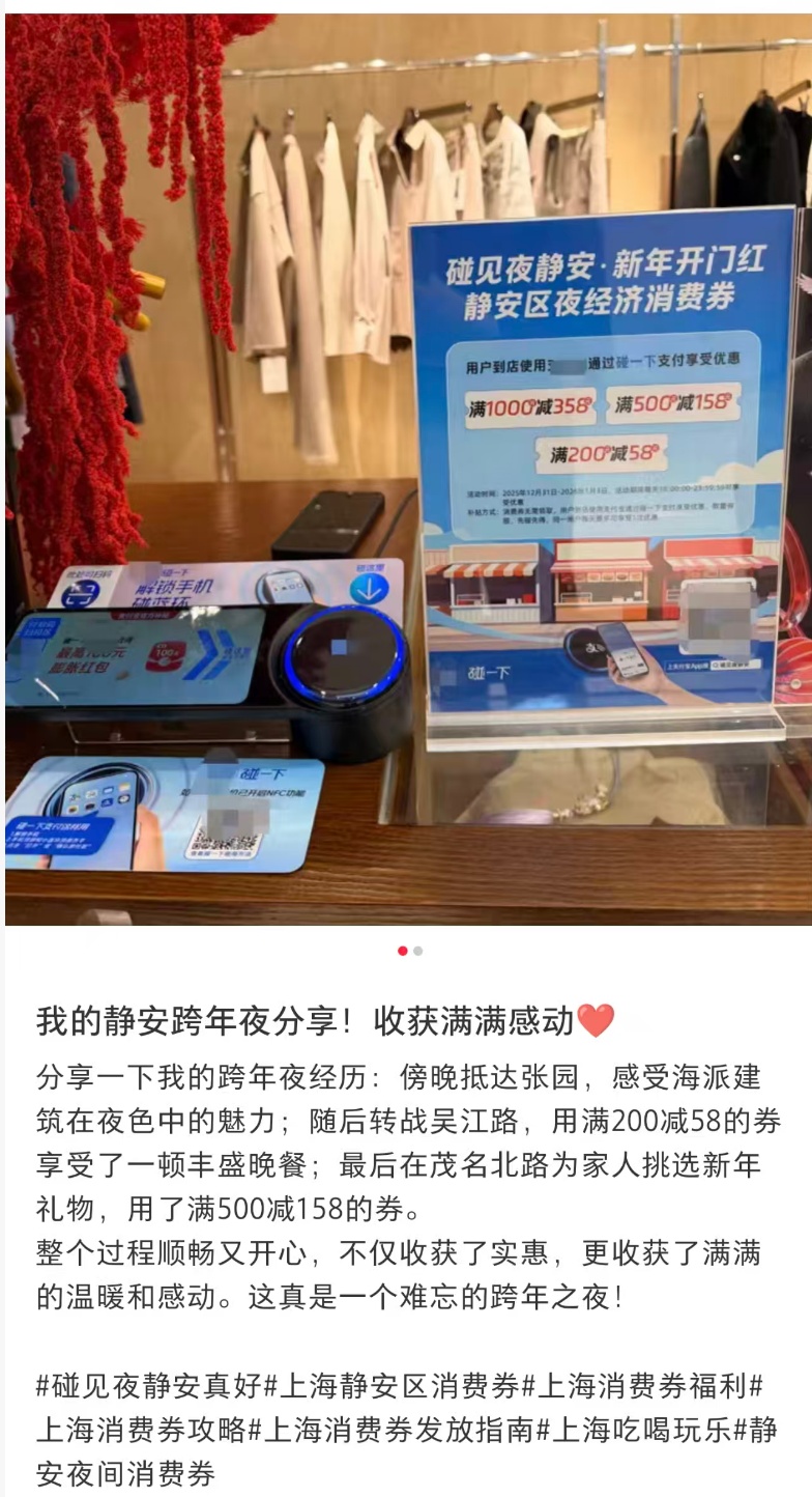 活动热度已迅速蔓延至社交平台,小红书、抖音等平台上好评如潮,“静安消费券太香了”“跨年逛吃静安,碰一下立减超划算”等呼声刷屏,网友们纷纷晒出打卡账单、现场热闹照片与福利攻略,自发为这场消费盛宴打call。