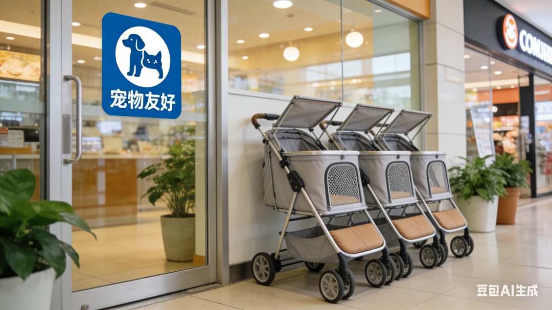 在外滩IFC商圈,不少门店都贴出了“宠物友好”标识。工作人员会细心提醒:“带宠物进来需要租借宠物推车,室内不允许宠物落地,室外区域则明文要求牵绳。”