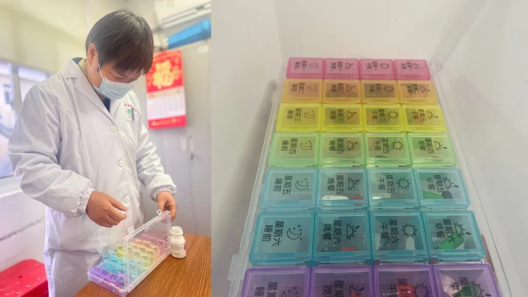 为解决老人“记不住”的难题,团队为老人配置了彩色分区的可视化药盒,由药师上门帮助老人把一周的药物分装好,同时设置定时闹钟提醒,在药盒旁张贴清晰的服药清单和打卡记录表。