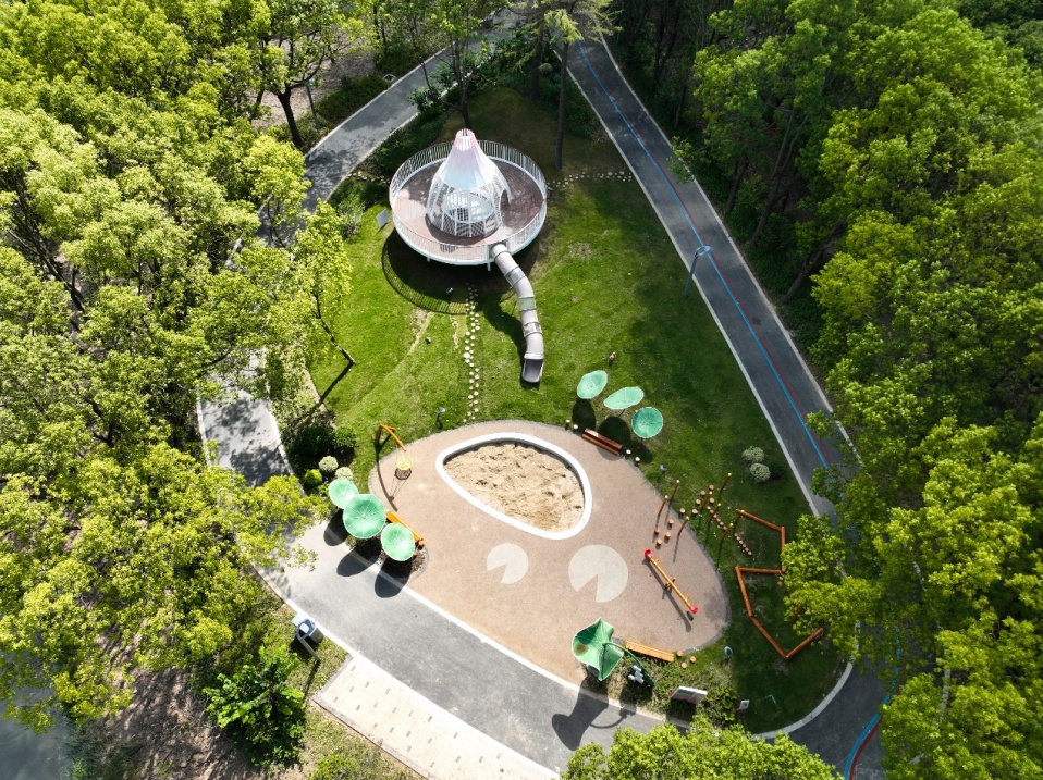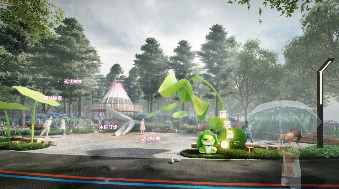结合林下空间,以趣味的荷叶、荷花造型设计互动儿童乐园,设置生态沙坑、荷梦树屋,营造生态、野趣的活动乐园。