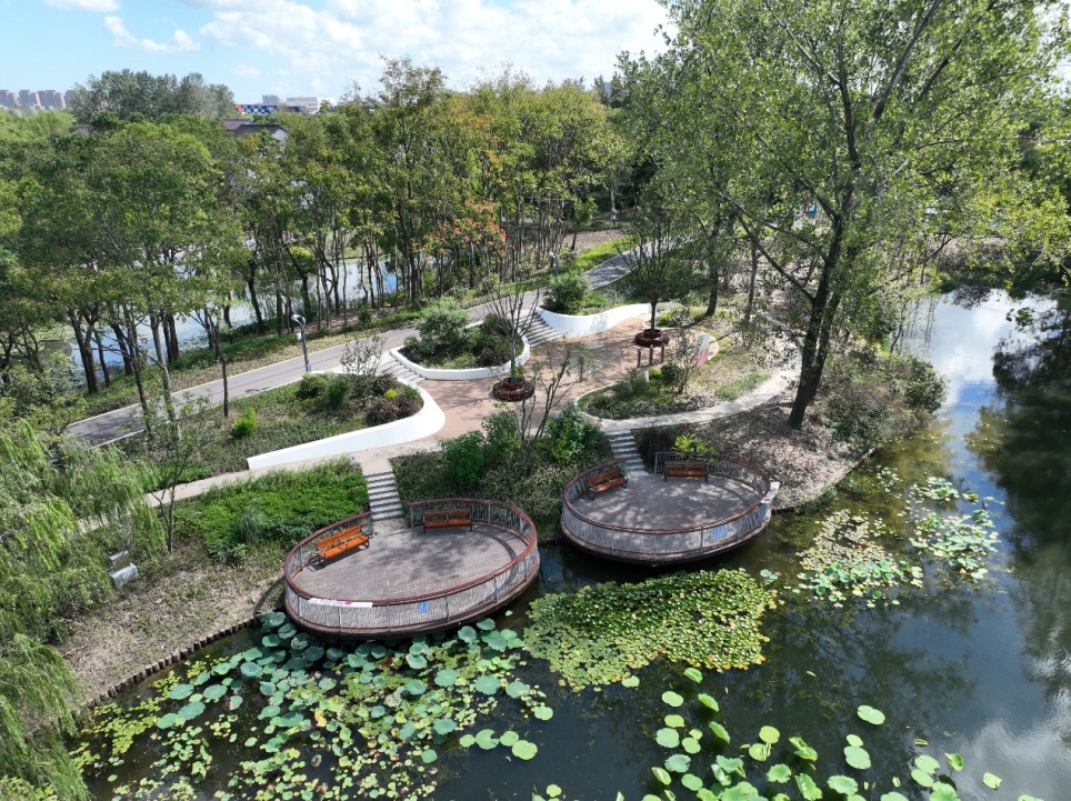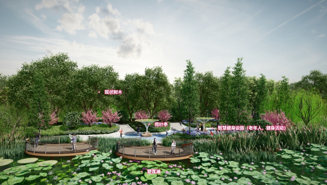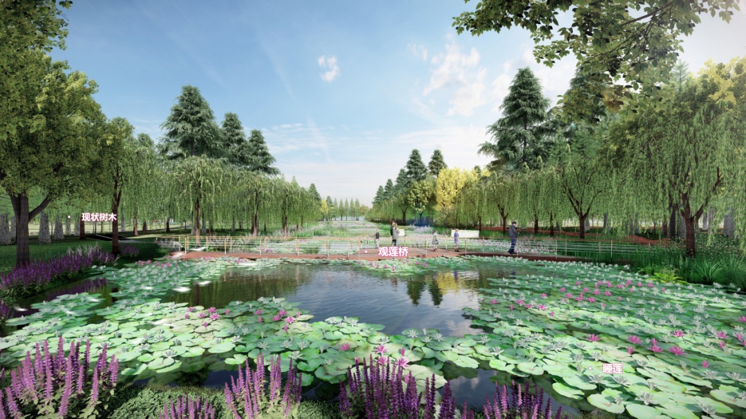 利用水面自然曲折形成的相对开敞空间,打造下沉小广场及圆形亲水平台,水中遍植荷花、睡莲,打造以滨水观荷、智慧互动、悠然漫步为一体的滨水观赏区。