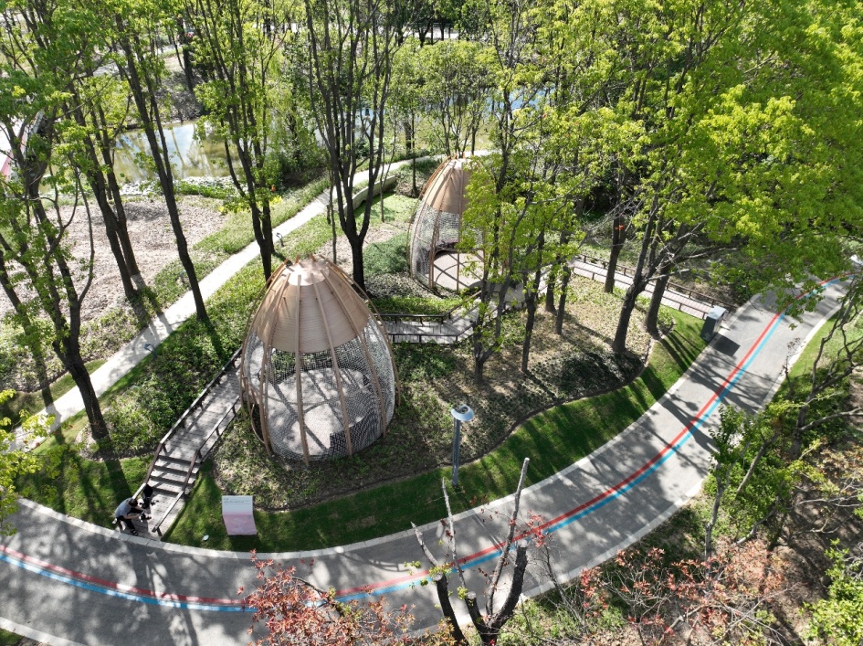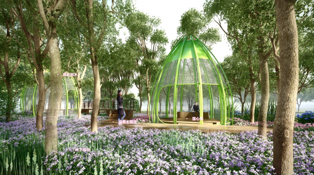 结合现状生态资源,设置以莲子元素进行设计的半围合构筑,打造静谧闲适的林下休憩空间。