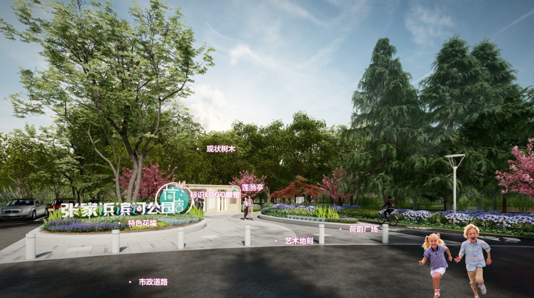 围绕荷韵主题,在尊重现状的基础上优化入口空间,打开入口广场空间,设置公园主题Logo,起到集散、打卡、引导人流的功能。