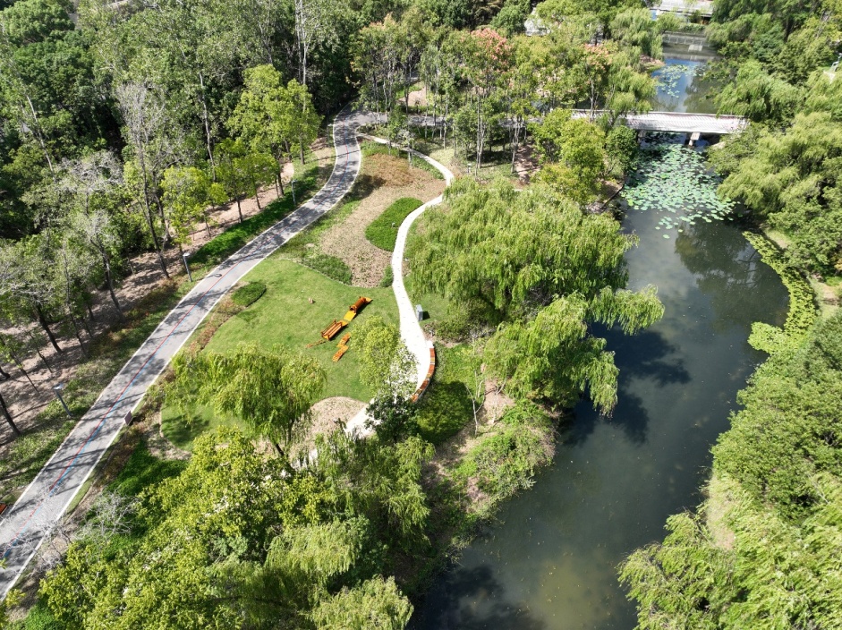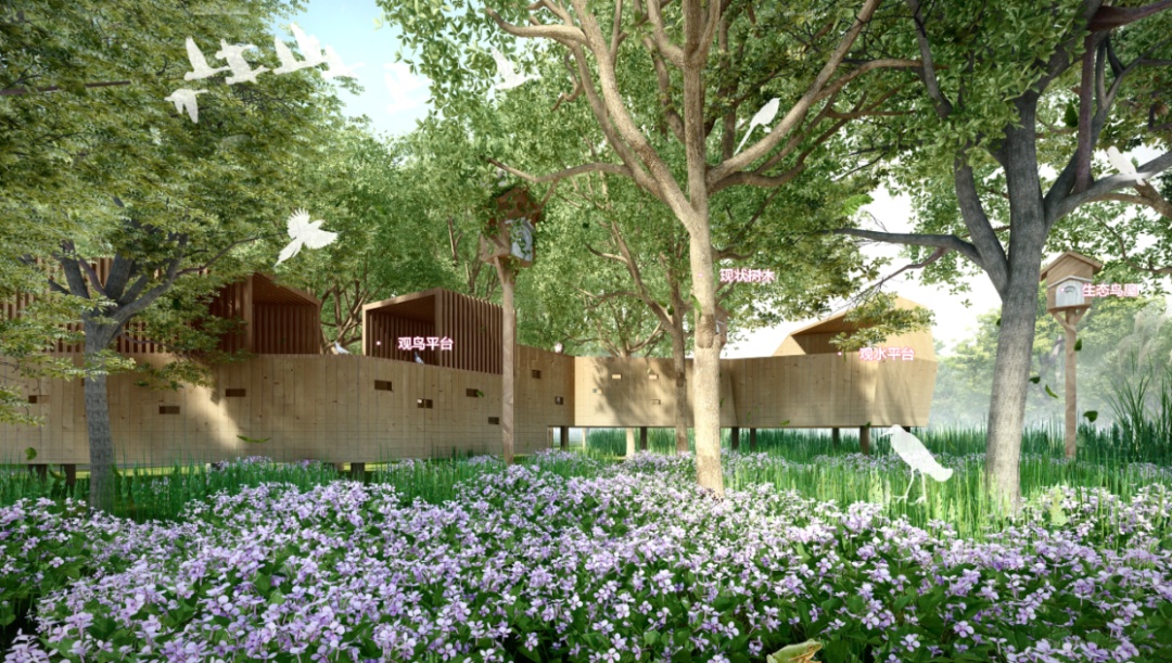 尊重现状生境,利用林下开敞空间,以低干预设计,设置观鸟平台,营建吸引鸟类的植物生境,满足鸟类、两栖动物观测的同时,为鸟类、两栖类提供栖息场所及食源。