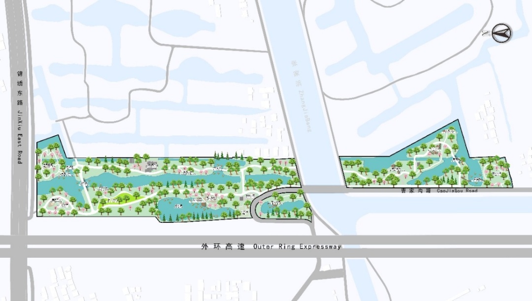 含北入口、荷韵桥、荷香驿,以绿道串联。北入口设置小型集散广场及公园Logo;荷韵桥联通园内交通断点,以杉林为背景,桥身为渐变的荷花粉色,水中遍植各色水生植物;荷香驿由园内原有建筑及周边空地改造而来,梳理现状植物、设置花坛坐凳,供市民休息、阅读、小型集散且兼具唐镇文化宣传展示之用。