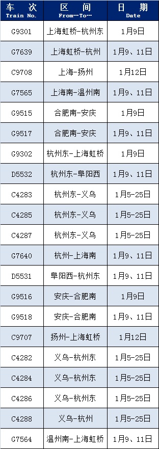 上海铁路客户服务中心介绍,根据旅客出行需求,铁路部门增开和恢复开行了部分旅客列车。增开列车包括G9301(上海虹桥-杭州东)、G7639(上海虹桥-杭州)等;恢复开行列车包括G3033/6(杭州西-汕头)、D3113(宁波-汕头)等。赶快过来看看有没有您需要的车次吧!详见↓增开列车统计截止日:1月7日 部分列车恢复开行统计截止日:1月7日