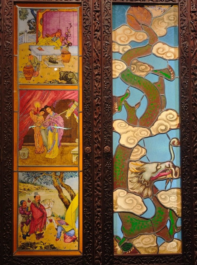 除了木雕,博物馆内另一件与“马”相关的珍宝同样不容错过,即一件制作于1912年的土山湾彩绘玻璃雕花橱柜。这个橱柜曾飘洋过海,在1915年美国旧金山巴拿马世博会上展出,后流落海外,直至2013年才重返上海。橱柜两侧柜门镶嵌的彩绘玻璃中,左下角一幅图案正是《三国演义》中“七擒孟获”的故事,其间亦有一匹白色骏马形象闪耀其中,与一旁的木雕骏马遥相呼应。这件作品也见证了土山湾作为“中国彩绘玻璃诞生地”的辉煌历史。