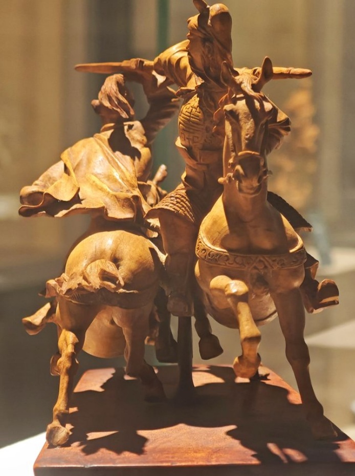 其中,作品《捉放曹》与《长坂坡》尤为引人注目。这两件作品中的三匹骏马,被刻画得形神兼备、英姿飒爽。在《捉放曹》中,徐宝庆以流畅的线条勾勒出马匹奔腾的体态,结合人物面部表情,生动再现了曹操逃亡时的紧张氛围;《长坂坡》则通过浮雕、镂雕等技法,以写实的肌肉纹理塑造出战马腾跃的瞬间,以小见大地展现了赵云单骑救主的勇猛气势与宏大场景。