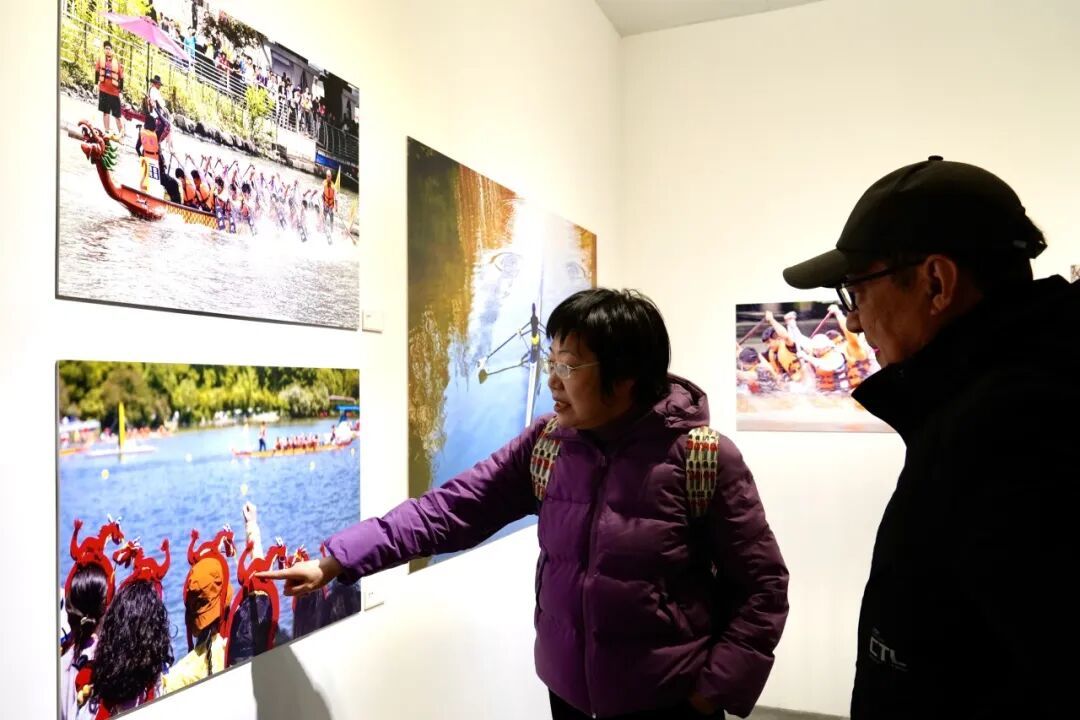 “半马苏河”板块聚焦苏州河普陀段沿线风貌,既有长风公园码头落日余晖下的静谧,苏州河如“静泊”般流淌;也有苏河水影映衬下的环球港双子塔,勾勒出“魅影”般的城市倒影;还有在夜幕中流光溢彩的TOP中央公园与智创TOP产城综合体,绘就桃浦发展的天际线。参展作者杜莉萍现场分享了其作品《龙舟共舞》的创作故事,作品以观赛者振臂呐喊的视角切入,生动传递出龙舟竞渡的激烈氛围,“那一刻的呐喊与振奋,正是我想定格的瞬间。”