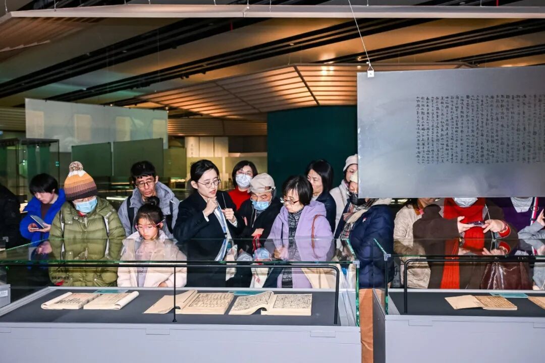 上图一年一度的馆藏精品大展,以文物与文献双线叙述,为读者打开了解江南文化的入口。上海图书馆历史文献中心馆员杨雪薇为读者讲述展品背后的故事,有不少读者特意选择了2025年的最后一天前来,“留下专属记忆”。