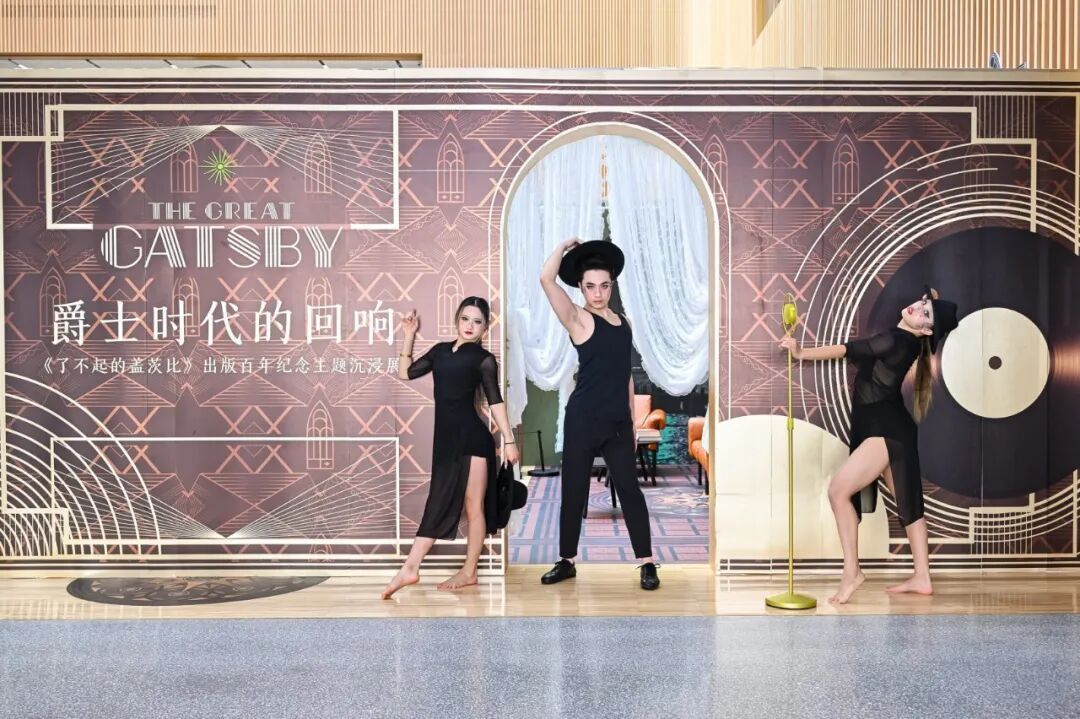 在5楼中庭“爵士时代的回响”主题沉浸展区,读者在逛展答题的同时,还能欣赏到上演爵士舞表演和沉浸式小剧场,盖茨比、黛西和尼克等书中人悉数登场,仿佛回到了那个喧哗年代。