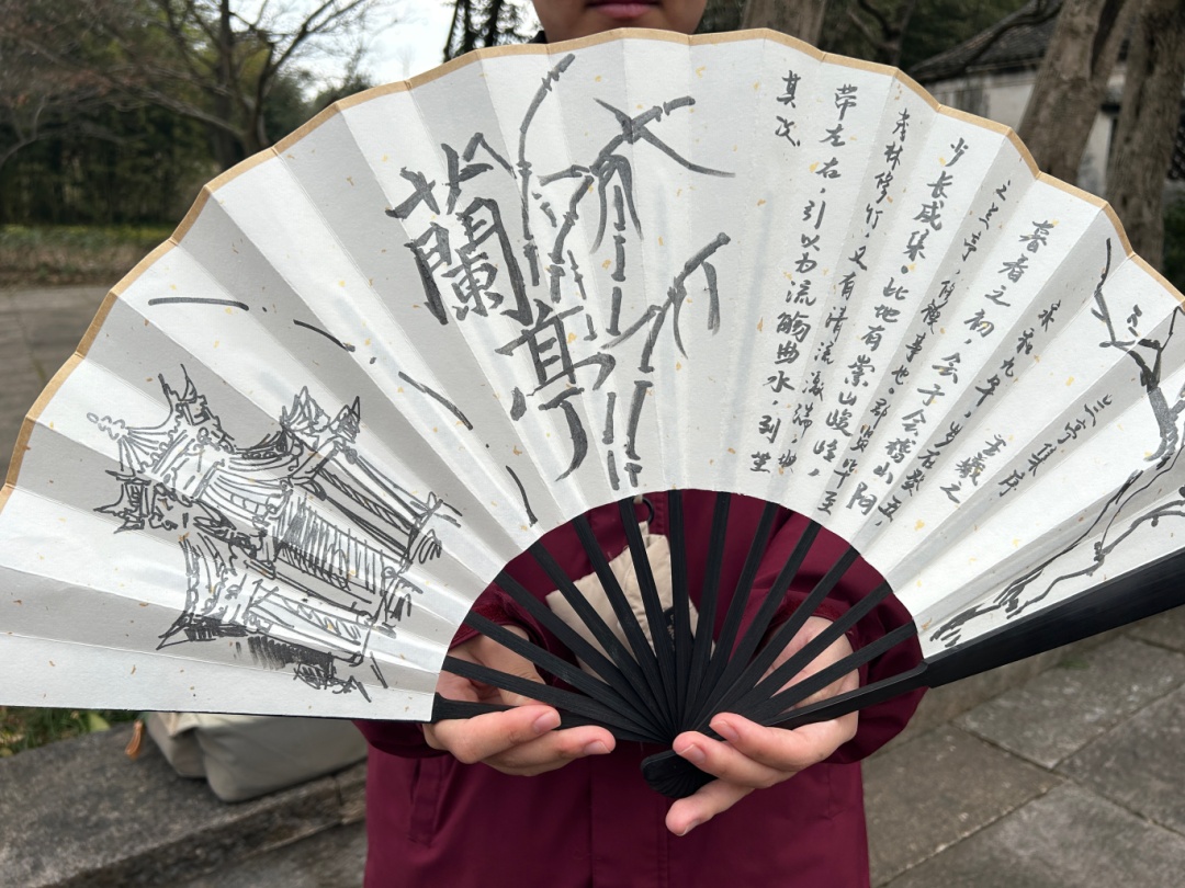 “两天的绍兴研学,比坐在教室里看书更有体会,也让我对这座城市有了实打实的感受。研学也不光是玩,而是用脚走、用眼看,把书本里的知识变成自己的体验。”高二(7)班学生赵紫璇说,去兰亭的时候,听着导游讲王羲之的故事、亲手在扇面上写字作画后才发现,书法不仅是写字,还藏着古人的风雅。在鹅池、流觞亭这些地方走一圈,课本里的“曲水流觞”一下子就变得鲜活了,不再是干巴巴的文字。