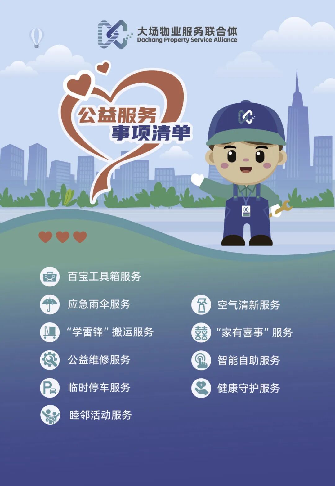 目前,大场物业联合体提供的公益物业服务涵盖“百宝工具箱”、应急雨伞、“学雷锋”搬运、公益维修、临时停车、睦邻活动、空气清新服务、“家有喜事”、智能自助、健康守护等十大方面。未来,联合体将持续整合资源,优化升级服务项目,让大场居民享受到更多公益服务,始终将“优质、专业、便利、贴心”作为不变的服务承诺。