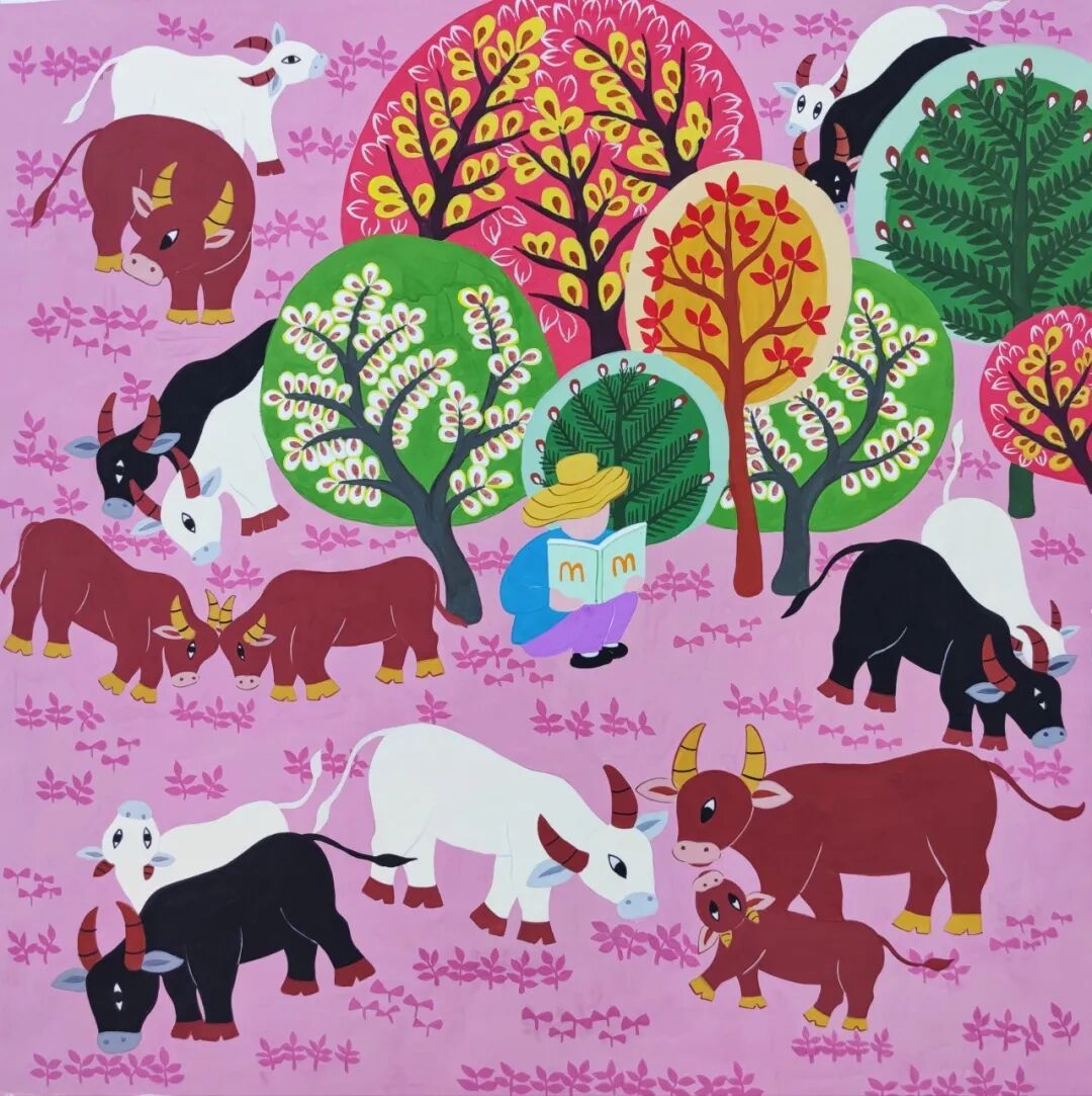 日前,陈惠方收到一份特别的邀约——为麦当劳“农情美味”主题系列设计包装画。一幅名为《田野牧歌》的作品,以麦当劳牧场的牛群为原型,用农民画标志性的明艳色彩和饱满构图,勾勒出一幅生态盎然、牛群闲适的田园图景,将“环保、健康、绿色”的理念悄悄藏进了方寸画纸间。