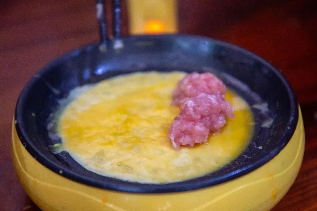 陶阿姨告诉记者,想要蛋饺吃起来鲜香多汁,肉馅的调配非常讲究。“肉馅得选用七瘦三肥的新鲜猪肉制作,加入味精、盐、白胡椒粉,再放入一点糖,用来提鲜。”陶阿姨说,“我还会加入2个鸡蛋,然后顺时针搅拌肉馅,这样吃起来弹牙爽口还多汁。”
