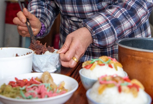 随后,在糯米里裹入绵密香甜的红豆沙馅,装入小碗中倒扣脱模,再铺上一层红绿丝、蜜枣、枸杞干和葡萄干,这碗农家八宝饭的香甜和年味儿就满溢了出来。“我每年都会做很多八宝饭,因为孩子们都喜欢吃。”潘月珍说。
