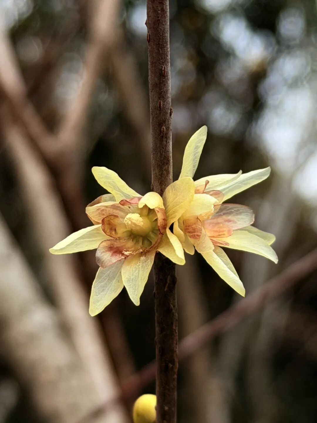 与往年不同,今年蜡梅已开,旧叶却还未落尽,别有一番韵味。细看花朵,花瓣修长,色泽清透,香气清雅幽远,在寒风中更显动人。