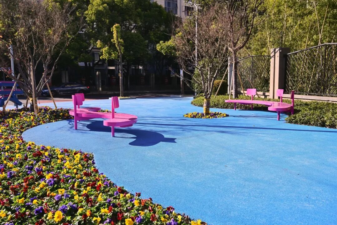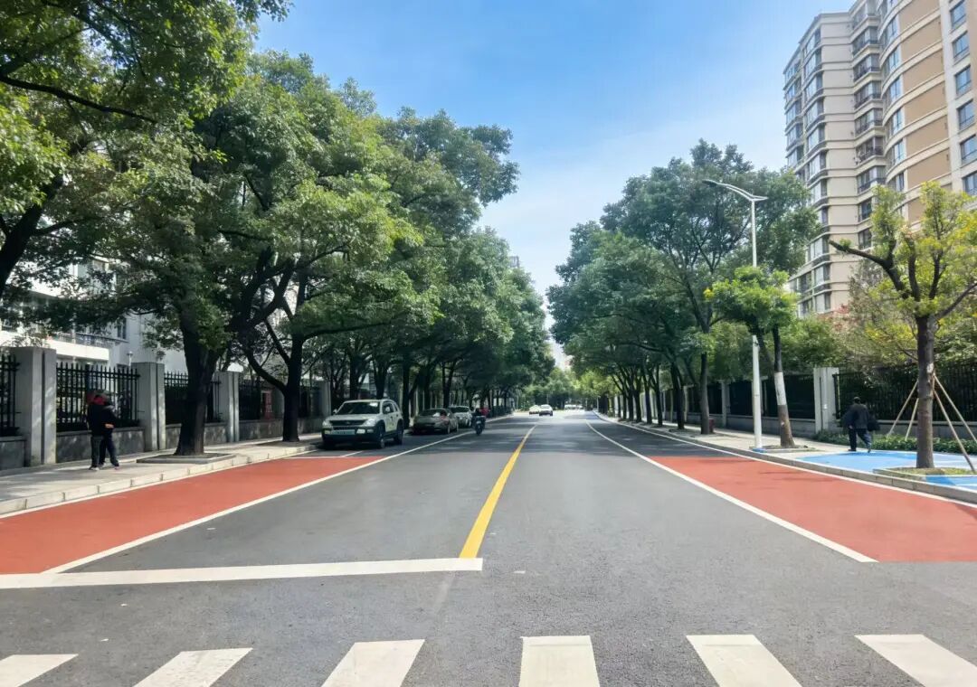 此外,此次改造还聚焦主要路口设施提升,将精选植物品类与彩色沥青路面巧妙搭配,营造出层次丰富的视觉体验。走在路上,只见高低错落的乔灌木与四季花卉巧妙搭配,形成富有层次的马路景观,让居民在出行中就能感受到扑面而来的生机和活力。“我就住在附近,这里打造的公共空间,有凳子可以坐,还有漂亮的绿化,感觉就是为我们额外打造了一个口袋公园,很好、很赞!”一位路过的居民竖起了大拇指。