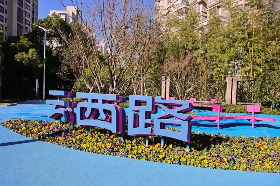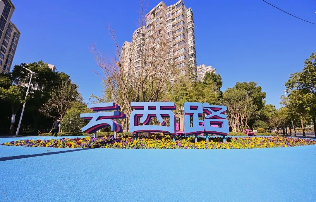 在云西路高境路路口能看到,浅蓝、蓝、深蓝三色沥青路面上,“云西路”三个彩色立体字醒目矗立在街角。粉彩色弧形座椅,点缀时令花卉,让不少趁着好天气走出家门的居民,在此处尽享冬日暖阳晒在身上的舒服感。