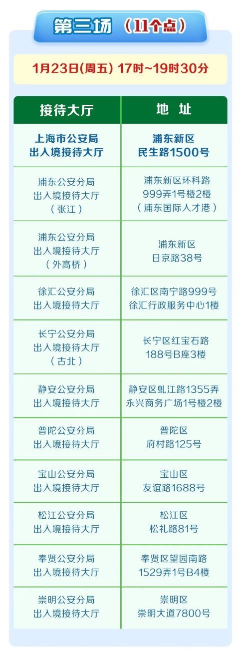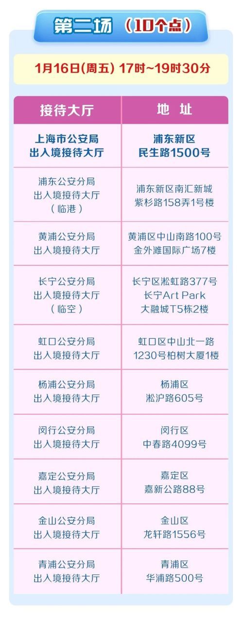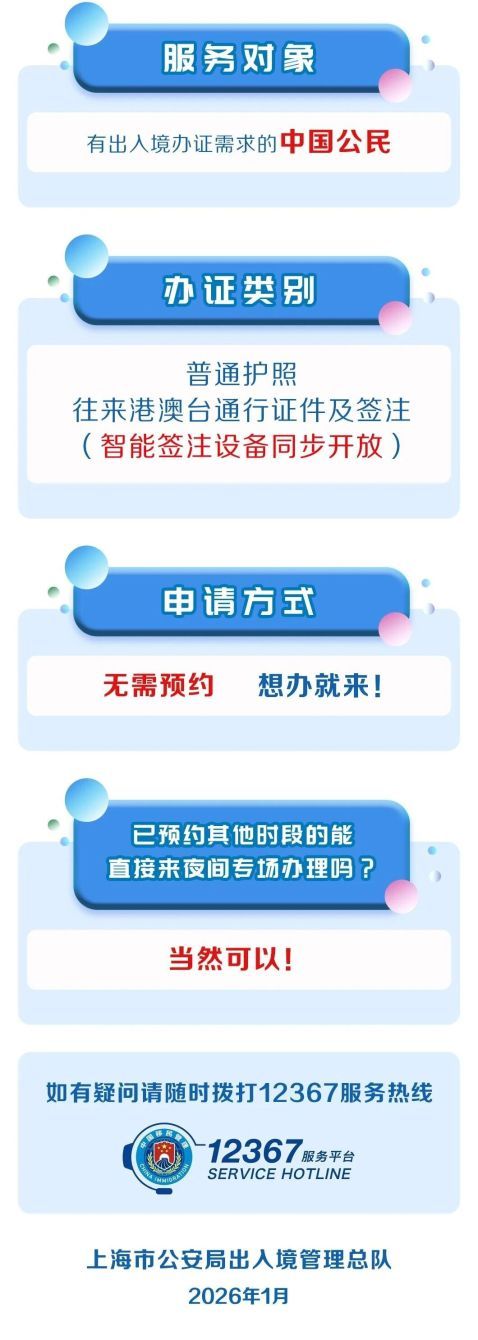 全市出入境接待大厅于2026年1月9日、16日、23日连续三个周五分批开设中国公民出入境办证夜间专场,统一延时开放至19时30分,满足群众寒假春节前办证需求,具体信息详见↓