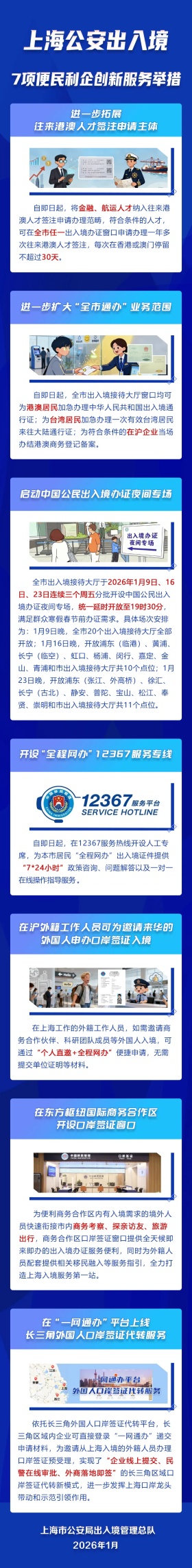 市公安局出入境管理总队推出7项便民利企创新服务举措,涵盖拓展往来港澳人才签注申请主体、扩大“全市通办”业务范围、开设“全程网办”12367服务专线等,覆盖中国公民及外籍人员出入境相关需求。一起来看详情↓