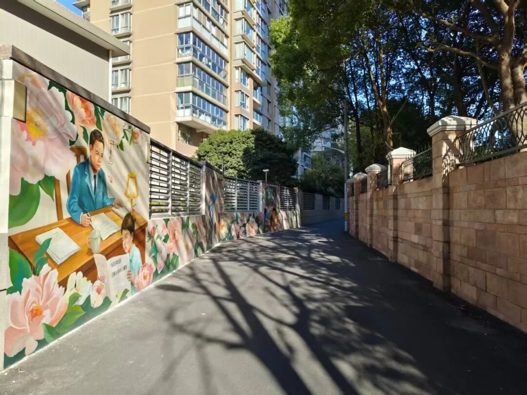 由南丹东路入口向内,社会工作站外立面焕然一新,围墙边增设了休憩驿站与非机动车停放区。南天大楼围栏上展示着徐家汇的百年变迁,而天钥桥路171弄的宛平南路菜场入口段则充满浓郁的市井生气,街道在此布置了便民座椅与公共宣传栏,让买菜归来的居民可以驻足小憩、闲话家常。天钥桥路171弄与南丹东路19弄,则转型为安静舒适的步行通道。两侧小区围墙修缮整齐,配以描绘赵巷历史人物的墙面彩绘,营造出一步一景、花影相伴的漫步体验。这条小径不仅便利了日常通行,也在细微处传递着地域文化,让回家之路成为一段轻盈的文化漫步。