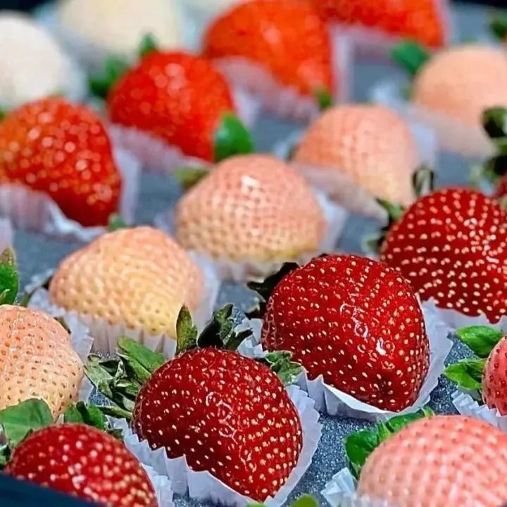 主打“红颜”“章姬”等主栽品种,搭配多个特色白草莓品种,果实个头大、口感香甜、色泽艳丽。