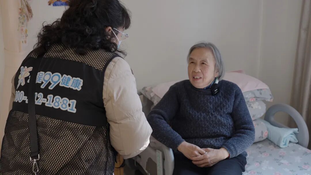 一边帮董阿姨穿衣服,陪诊师一边询问董阿姨身体状况,在了解了基本需求后,在狄雅美的搀扶下,董阿姨出门了。