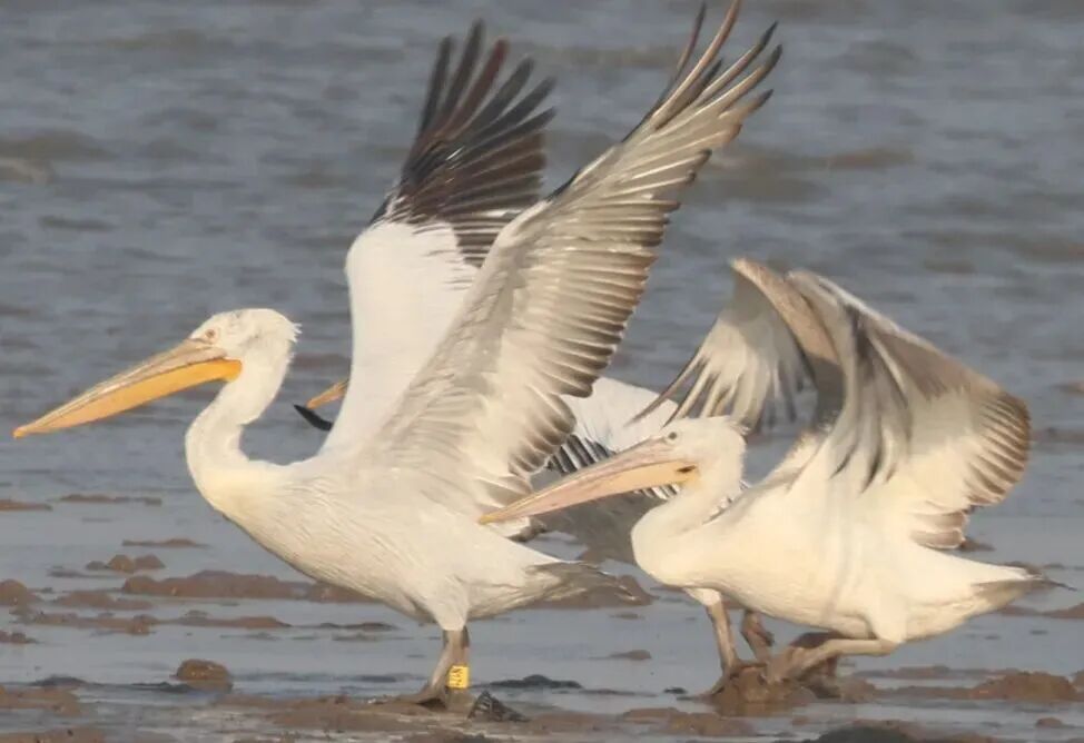 更令人振奋的是,其中一只卷羽鹈鹕的脚踝上,戴着一枚来自蒙古国的环志。经确认,这只彩环(黄底黑字)编码为N171的卷羽鹈鹕于2020年8月12日在蒙古国哈拉乌斯湖(Khar Us Lake)被环志,环志者是Nyambayar Batbayar。