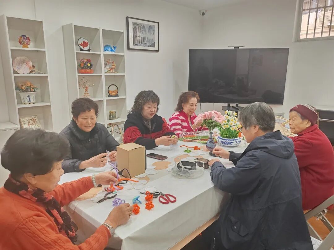 几位70多岁的老年人在“pk”乒乓球,活力四射;好闺蜜们围坐在一起巧手翻飞,扭扭棒似乎被施了魔法变成可爱的小花;八段锦爱好者则跟随视频沉浸其中……此刻,从养老服务站里传来的阵阵欢笑声,深深感染着张雅玉。