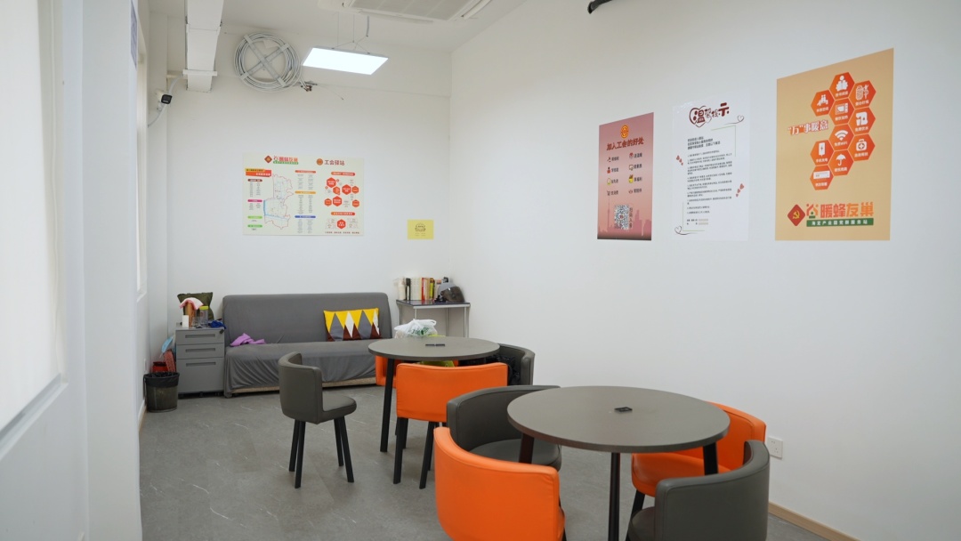 这份温暖还延伸到了更多城市一线劳动者。在“交心驿”靠近马路的正门旁,专门开辟了共享休息区与活动室,环卫工人、快递员累了、渴了,都能进来喝杯热水、歇个脚,感受城市的关怀。